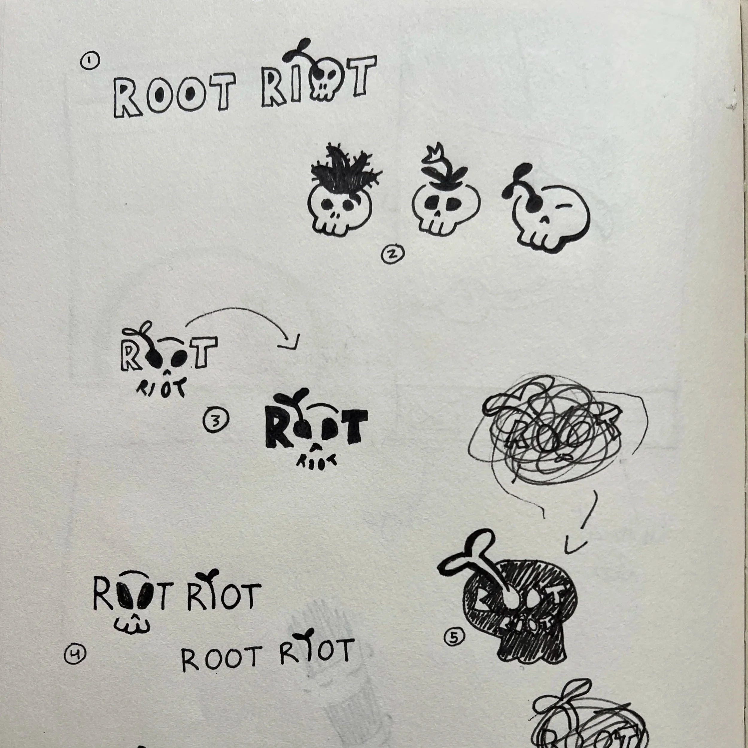 Root Riot’s competitors follow the same pattern: minimalism, tidiness, and pristine plants. Root Riot works in real conditions—plant care that’s messy, chaotic, and rewarding. The logo and digital identity had to show that. Ideation started with mind-mapping visuals to move past cliché motifs and into something distinctly Root Riot. Skull imagery was introduced to express learning through mistakes and the loss that comes with growing houseplants.